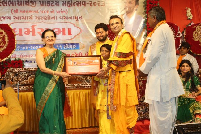 તારીખ 16 4 2023 ના મહાપ્રભુ શ્રીમદ વલ્લભાચાર્ય જી ના પ્રાગટ્ય ઉત્સવ નિમિત્તે એક સપ્તાહથી ઉજવાતા મહોત્સવની પૂર્ણાહુતિ રૂપે યોજાયેલ” ધર્મ સભા” માં પોરબંદરની એક સેવાભાવી સંસ્થા આશા હોસ્પિટલનું સન્માન કરવામાં આવ્યું તથા એક સેવાભાવી વ્યક્તિ તરીકે ડોક્ટર સુરેખા શાહ ને” વિશેષ વ્યક્તિ” તરીકેનું સન્માન તેમણે વિવિધ ક્ષેત્રોમાં કરેલ સેવાઓ બદલ પરમ પૂજ્ય ગોસ્વામી 108 શ્રી વસંત રાયજી મહારાજના હસ્તે એનાયત કરવામાં આવ્યો