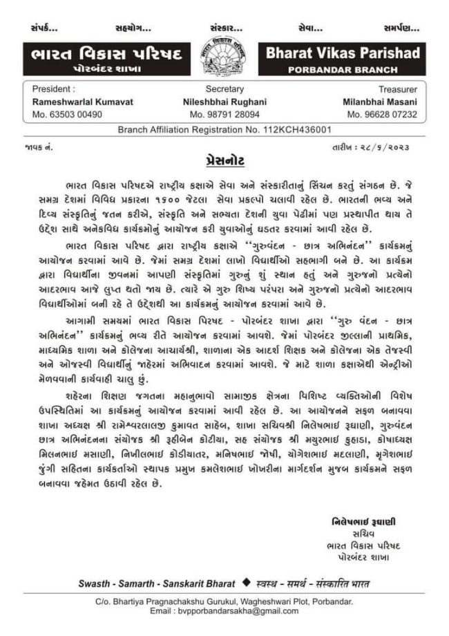 આગામી સમયમાં ભારત વિકાસ પિરષદ – પોરબંદર શાખા દ્વારા “ગુરુ વંદન – છાત્ર અભિનંદન” કાર્યક્રમનું ભવ્ય રીતે આયોજન કરવામાં આવશે. જેમાં પોરબંદર જીલ્લાની પ્રાથમિક, માધ્યમિક શાળા અને કોલેજના આચાર્યશ્રી, શાળાના એક આદર્શ શિક્ષક અને કોલેજના એક તેજસ્વી અને ઓજસ્વી વિદ્યાર્થીનું જાહેરમાં અભિવાદન કરવામાં આવશે. જે માટે શાળા કક્ષાએથી એન્ટ્રીઓ મેળવવાની કાર્યવાહી ચાલુ છું.