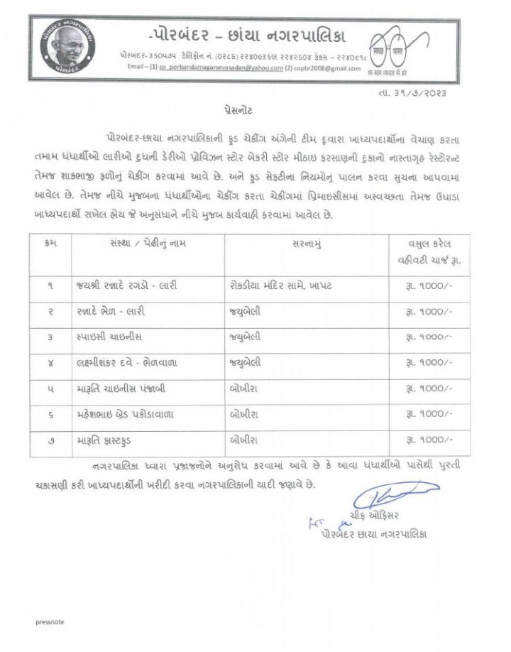HomePorbandarપોરબંદર નગર પાલિકાના ફૂડવિભાગે ચેકીંગ દરમ્યાન કરી દંડાત્મક કાર્યવાહી nimeshgAug 2, 2023 0 Please follow and like us: Spread the love CATEGORIES PorbandarAUTHORnimeshg