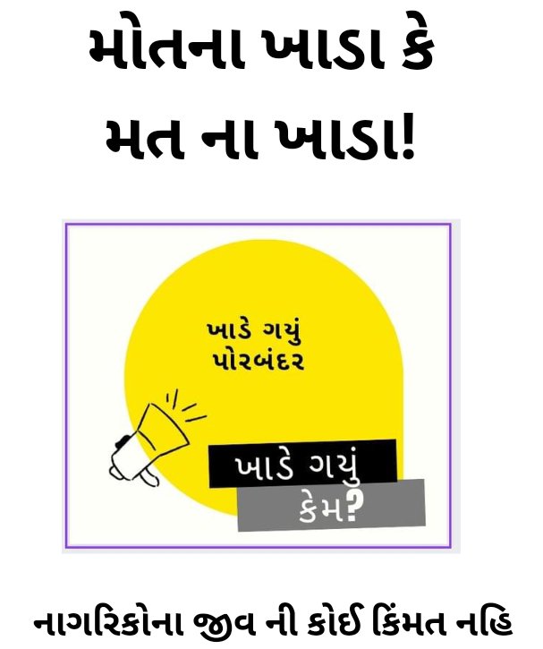 હાલ નેતા ઓ ચૂંટણી પ્રચાર માં વ્યસ્ત ત્યારે પોરબંદર માં ઠેર ઠેર ખાડા થી .લોકો ત્રાહીમામ પોકારી ઉઠ્યા છે. કોઈ મોટા રાજકારણી કે મુખ્ય મંત્રી શહેર માં આવવાના હોય ત્યારે તાત્કાલિક રોડ બની જાય છે ( ઉદાહરણ માધવપુર ના મેળા સમયે પોરબંદર શહેર થી માધવપુર જતા રોડ યુધ્ધ ના ધોરણે બનતા હતા ).કામ કરશો તો મત મળશે ..હવે નાગરિકો પણ સમજે છે. કમલાબાગ પાસે રોજ અનેક અકસ્માત થઈ રહ્યા છે.ત્યારે હવે નેતાઓ નાગરિકો ના મોત ની રાહ જોવે છે કે મત ની રાહ જોવે છે!
