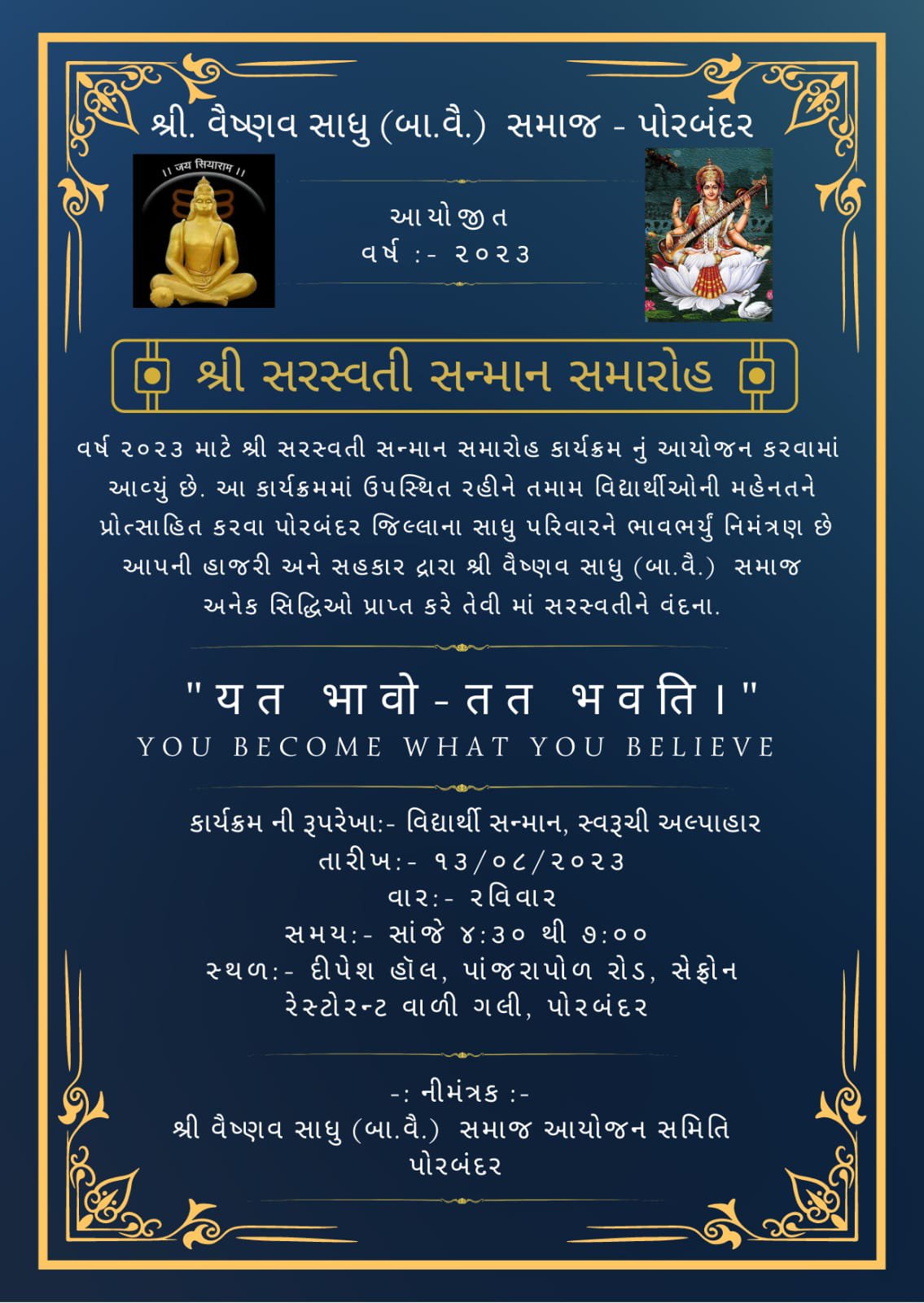 પોરબંદર જિલ્લા માં રહેતા અનેક વૈષ્ણવ સાધુ પરીવાર ના બાળકો એ શૈક્ષણિક ક્ષેત્રમાં ધોરણ 8 થી કોલેજ સુધી સફળતા પ્રાપ્ત કરી હોય તેવા તેજસ્વી તારલાઓ નું સન્માન કરવામાં આવશે જેનાથી અન્ય બાળકો પણ પ્રેરણા લઇ શકે અને સમાજ નું નામ રોશન કરે તેવા હેતુ થી શ્રી વૈષ્ણવ સાધુ સમાજ ( બા.વૈ) પોરબંદર દ્વારા યોજાનાર આ કાર્યક્રમ માં શ્રી રામકૃષ્ણ મિશન પોરબંદર ના સ્વામી પ્રેષ્ઠાનંદ તથા સ્વામી ચિરંતાનંદ સ્વામિ તથા સમાજ ના આગેવાનો ઉપસ્થિત રહી વિદ્યાર્થીઓને પ્રોત્સાહિત કરશે. પોરબંદર ના વૈષ્ણવ સાધુ સમાજ ના પરિવારજનો સાથે ઉપસ્થિત રહી સમાજ ના વિદ્યાર્થીઓને પ્રોત્સાહિત કરવા અને કાર્યક્રમ ની શોભામાં વધારો કરવા શ્રી વૈષ્ણવ સાધુ સમાજ આયોજન સમિતિ પોરબંદર દ્વારા ભાવભર્યું આમંત્રણ પાઠવવામાં આવ્યું છે.