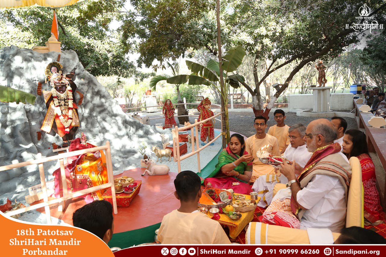 પોરબંદરમાં સાંદીપનિ વિદ્યાનિકેતનમાં શ્રીહરિમંદિરમાં શ્રીલક્ષ્મીનારાયણ ભગવાન સહિતના વિગ્રહોની પ્રતિષ્ઠા વર્ષ ૨૦૦૬માં મહાસુદ રથસપ્તમીના દિવસે થઈ હતી. જેને આ ૨૦૨૪મા વર્ષે ૧૮વર્ષ પૂરા થઈ રહ્યા છે. આથી પ્રતિવર્ષની જેમ પૂજ્ય ભાઇશ્રી રમેશભાઈ ઓઝાના સાન્નિધ્યમાં ત્રિદિવસીય શ્રીહરિ મંદિરના ૧૮મા પાટોત્સવનું દિવ્ય અને ભવ્ય આયોજન થયું છે. તેમાં આજે તા.૧૪/૦૨/૨૦૨૪, બુધવારના રોજ વસંતપંચમી પાવન દિવસે ધાર્મિક અને પ્રવચનાત્મક કાર્યક્રમ તથા સરસ્વતીમાતાનું પૂજન-અર્ચન, ગોવર્ધનપૂજન એવં ગોપૂજન સાથે પ્રારંભ થયો હતો.