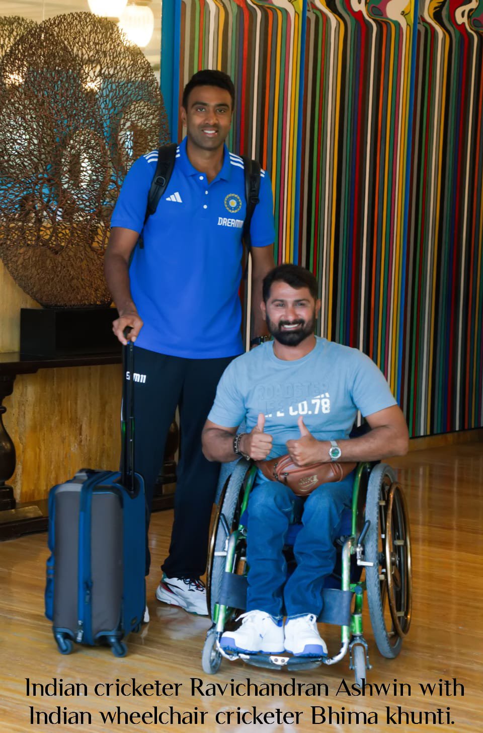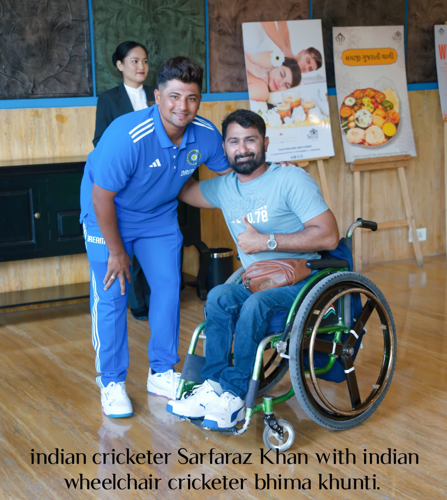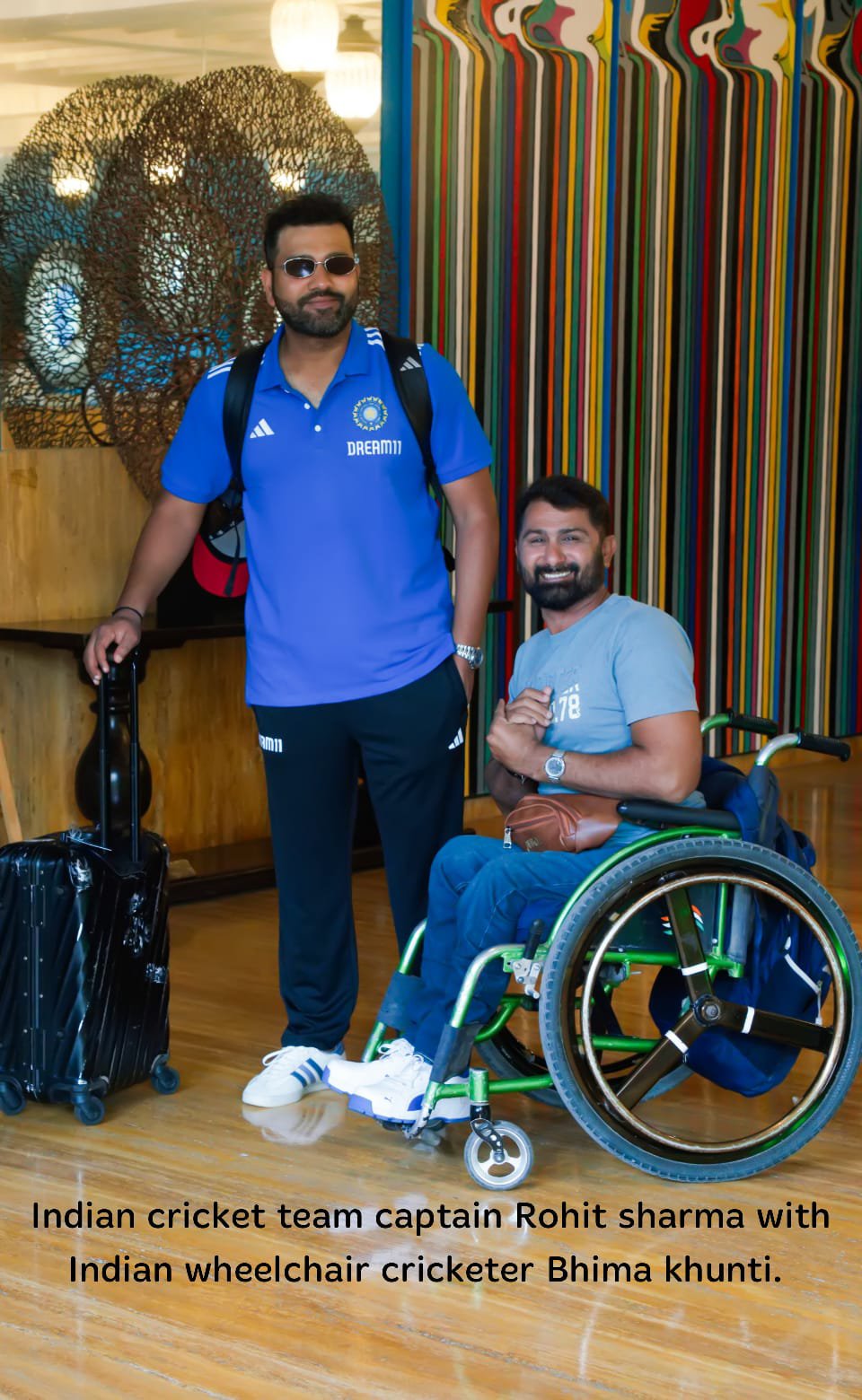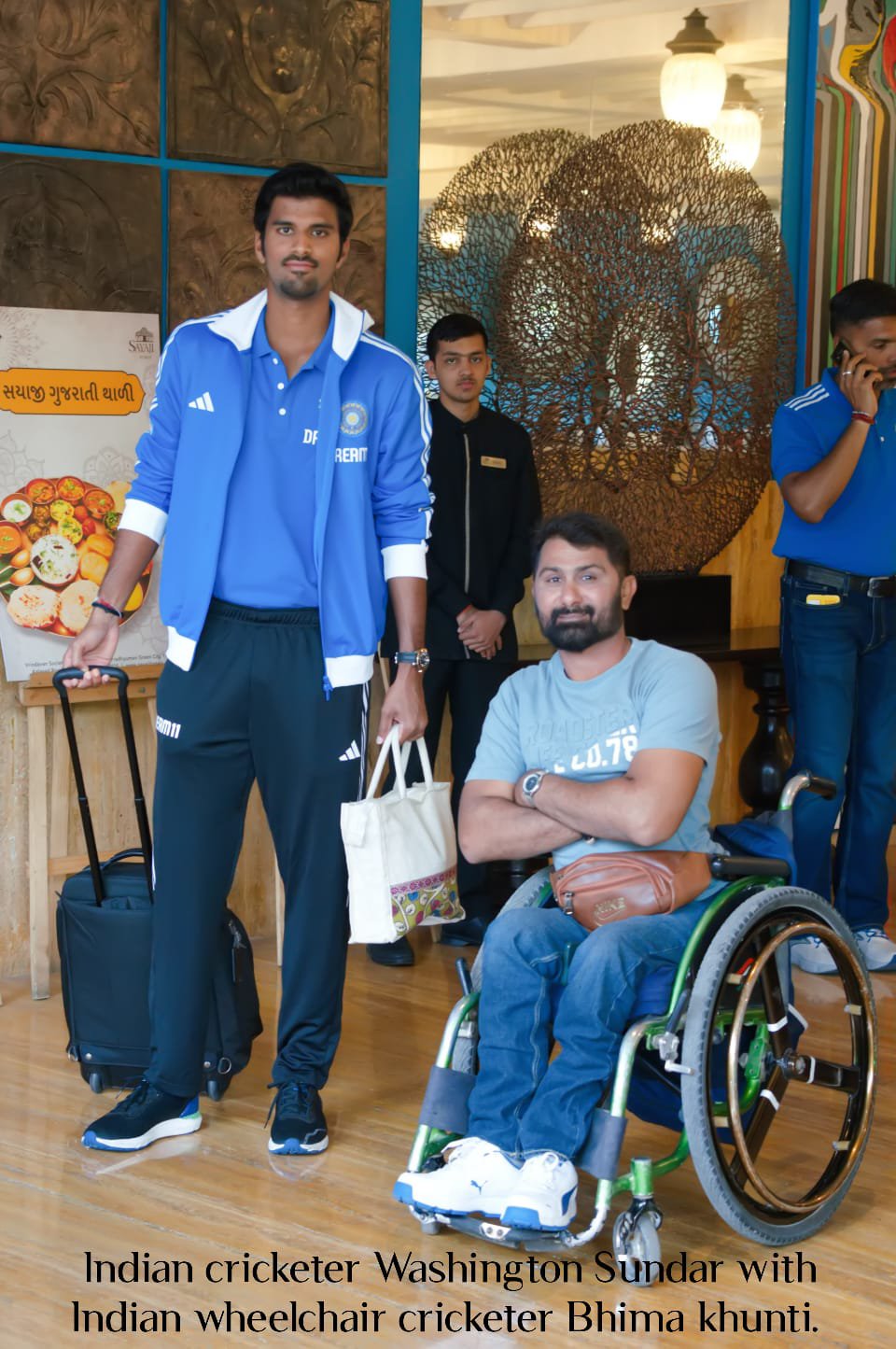 ઇન્ડિયા ઇંગ્લેન્ડ વચ્ચે ટેસ્ટ સીરીઝ રમાઈ રહી છે તેમાની ત્રીજી ટેસ્ટ રાજકોટના નિરંજન શાહ સ્ટેડિયમમાં રમાઈ હતી. આ ટેસ્ટમાં ભારતે 434 રનથી એક વિશાળ જીત હાસિલ કરીને સિરીઝમાં 2-1 થી બળત બનાવી લીધી છે જ્યારે આ ટેસ્ટ જીતવાની ખુશીમાં આપણા ગુજરાતનું ગૌરવ અને ઇન્ડિયા ની વ્હીલચેર ક્રિકેટ ટીમના ખેલાડી અને ગુજરાત ની વ્હીલચેર ક્રિકેટ ટીમના કેપ્ટન ભીમા ખુટી ગઈ કાલે હોટેલ સયાજી ખાતે ભારતની ટીમ સાથે શુભેચ્છા મુલાકાત કરી હતી. ભીમા સાથે વાત થઈ હતી ત્યારે ભીમા એ જણાવ્યું હતું કે અત્યારે ભારતની ટીમ એવું પરફોર્મ કરી રહી છે કે તે જોઈને લાગી રહ્યું છે કે વિશ્વની કોઈપણ ટીમને હરાવી શકે છે. અને બીજું કે હું રોહિતભાઈ ને ક્યારે મળ્યો ન હતો એટલે રોહિતભાઈ ને મળીને હું પણ ખૂબ આનંદની લાગણી અનુભવી રહ્યો છું સાથે પૂરી ટીમ ઇન્ડિયા ને મળવાનું થયું હતું એટલે આ ક્ષણ મારા માટે પણ એક જિંદગીની યાદગાર ક્ષણો માની એક બની ગઈ હતી.