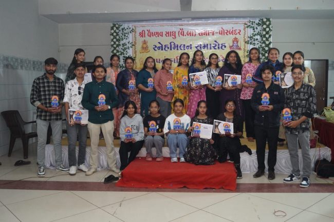 પોરબંદર જિલ્લાના શ્રી વૈષ્ણવ સાધુ (બા. વૈ.) સમાજ દ્વારા સમાજના દીકરીઓ અને દીકરાઓએ શિક્ષણક્ષેત્રે હાંસલ કરેલી સિદ્ધિઓને બિરદાવવા અને તેમની કારકિર્દીને પ્રોત્સાહન આપવા હેતુસર “સ્નેહમિલન અને શ્રી સરસ્વતી સન્માન સમારોહ ૨૦૨૬” નું આયોજન રવિવાર, તા. ૧૧ જાન્યુઆરી ૨૦૨૬ના રોજ શ્રી સોરઠીયા ધોબી સમાજની વાડી, બિરલા હૉલ રોડ, પોરબંદર ખાતે કરવામાં આવ્યું હતું.
